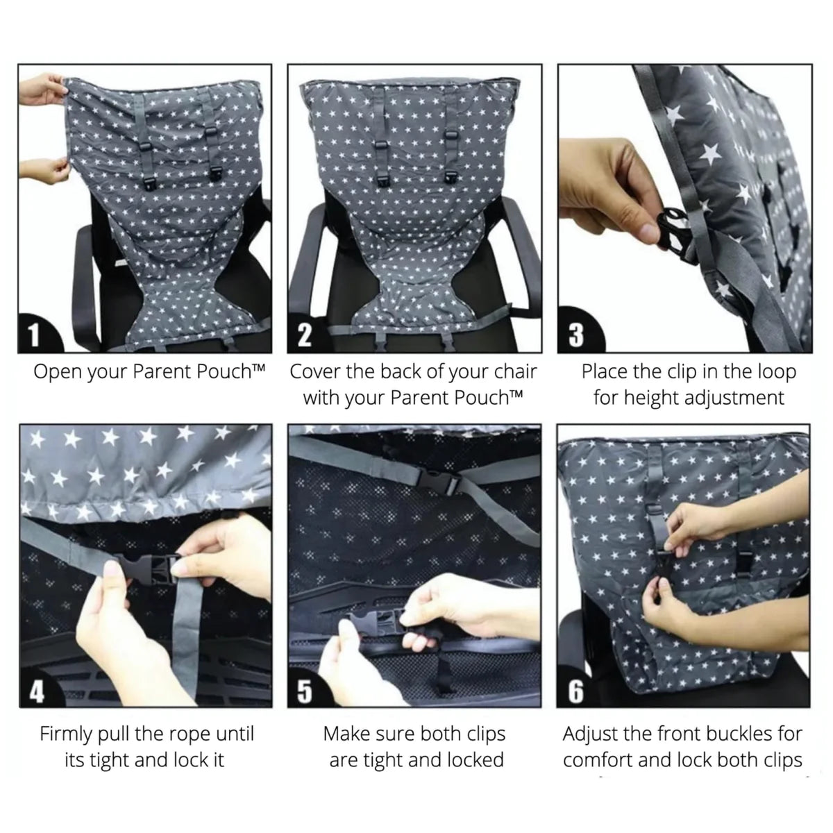Parent Pouch™ fits 99% of chairs. Parent Pouch™ will not work with restaurant booths or bean bags seats.